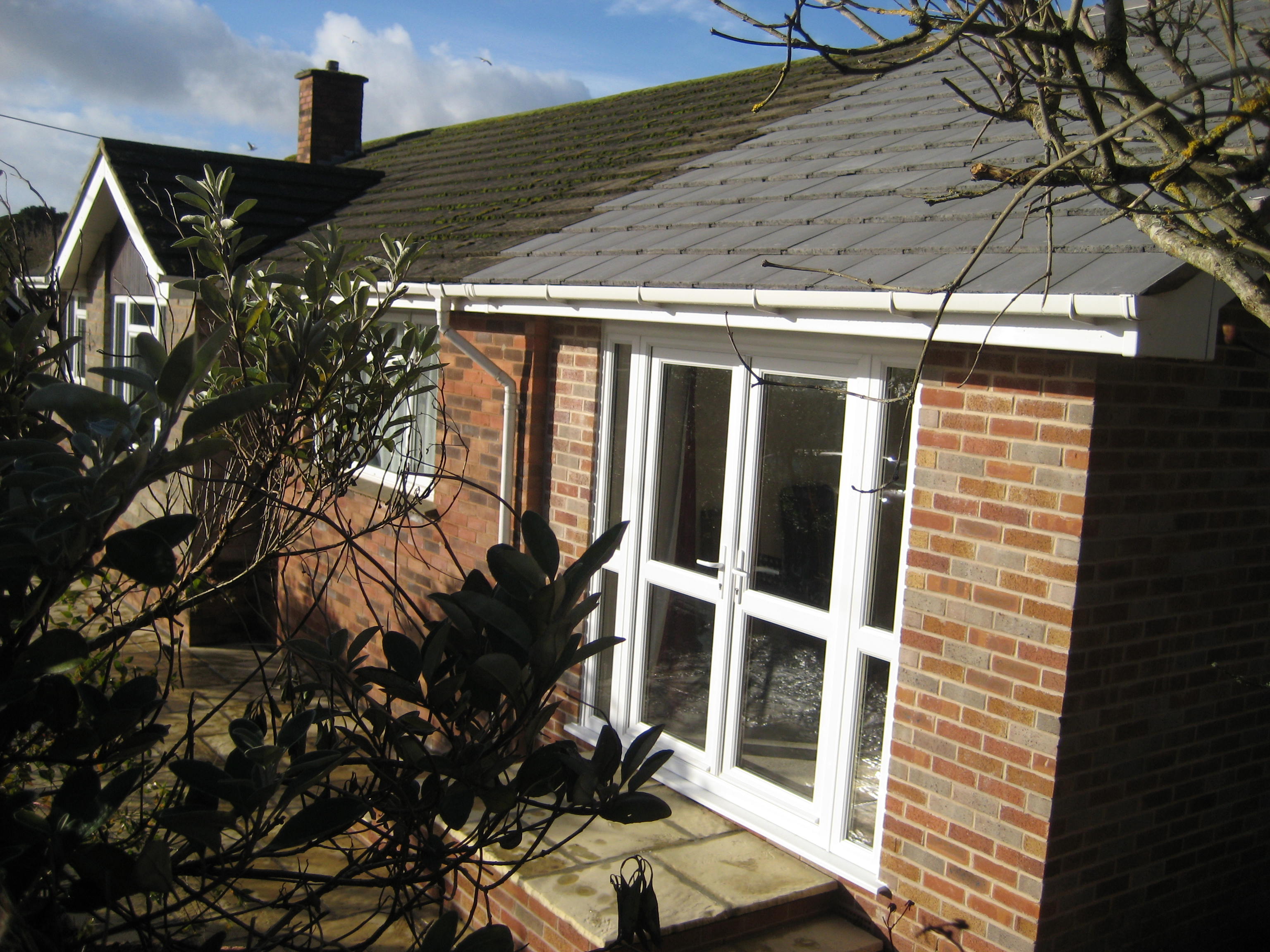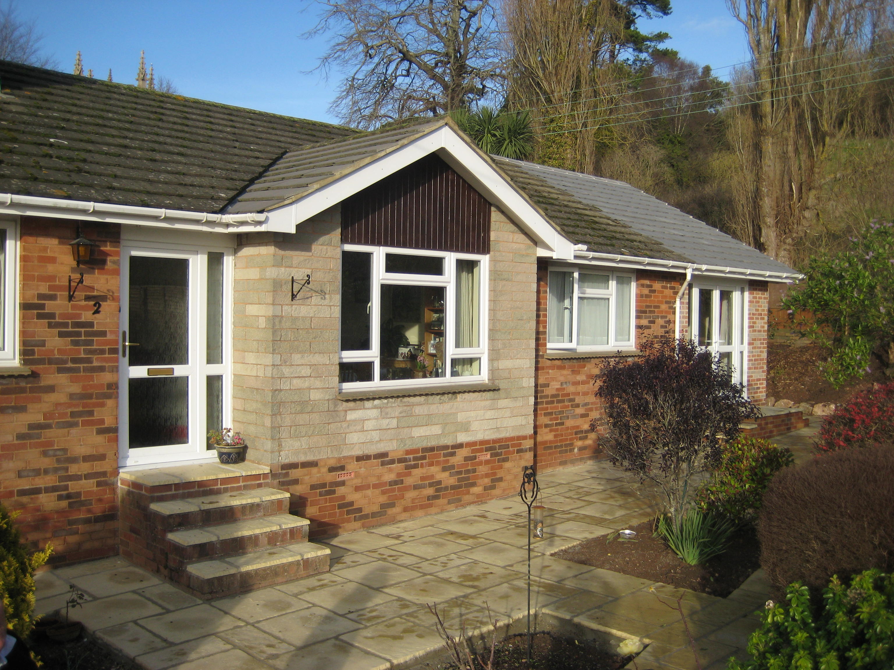 The extension comprised a useful new study/bedroom with an ensuite bathroom. The feature french windows and lockable connecting door allow the new rooms to be annexed if required. The opportunity was taken, whilst on site, to clear vegitation and lay a new patio which receives available sunshine for most of the day. This kind of extension is cost effective and we think you’ll agree, the results are very pleasing!